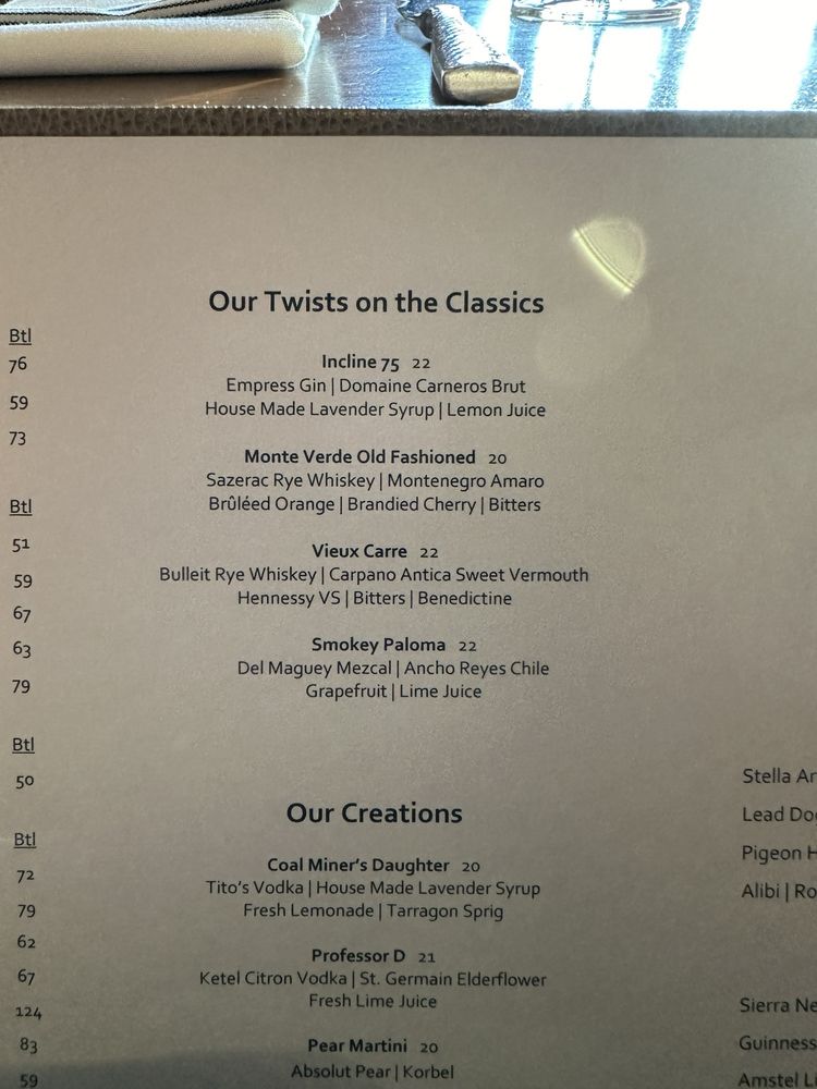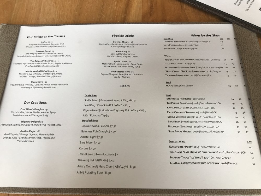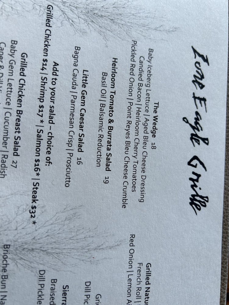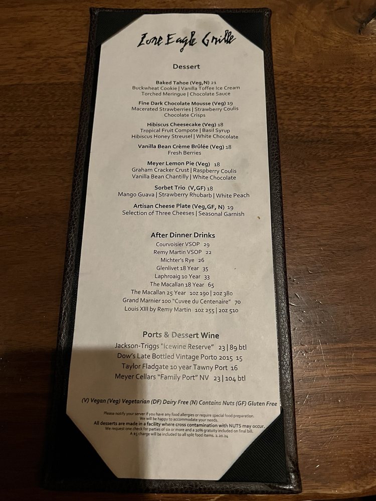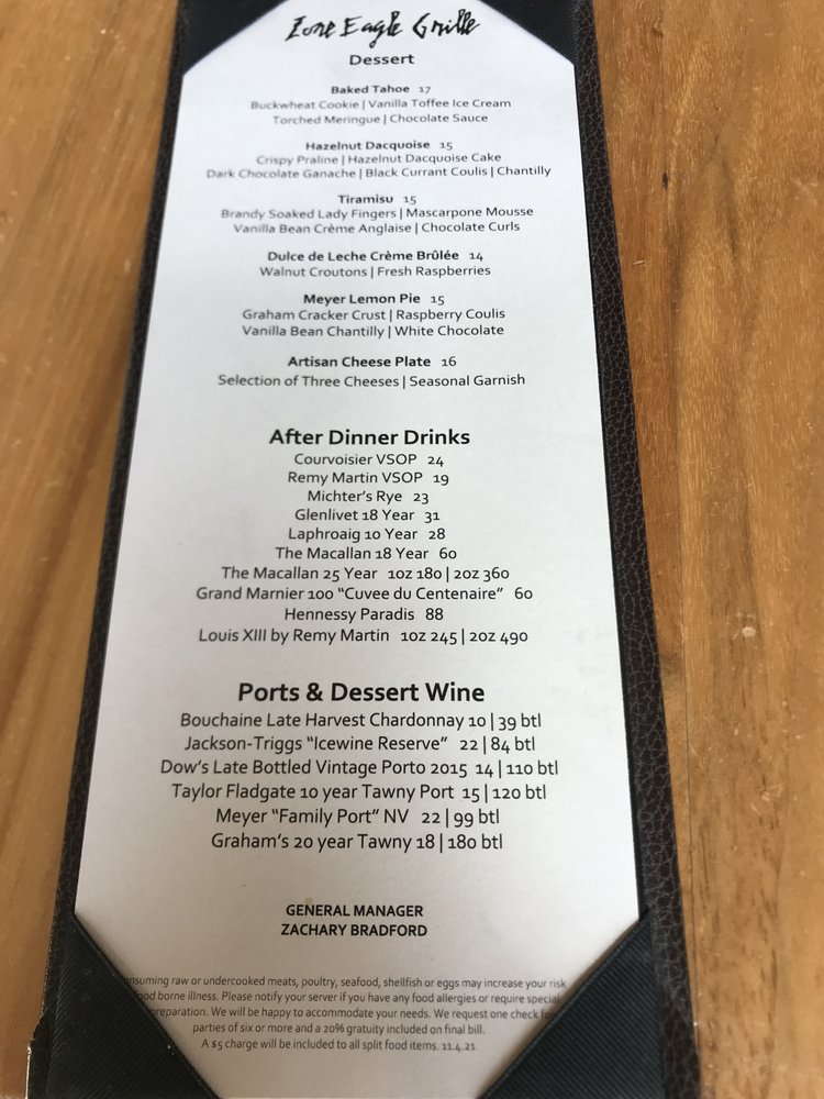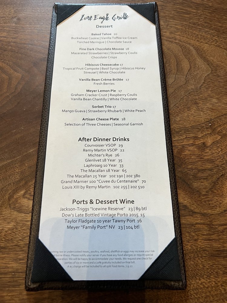 Introducing the menu at Lone Eagle Grille, a classy and elegant restaurant located in Incline Village, Nevada. This waterfront restaurant offers a variety of delicious American dishes with great specials, a good wine list, and a full bar. The ambiance is cozy with stunning views of the lake, perfect for a special dining experience. Customers rave about the French onion soup, baked Tahoe, chicken breast salad, mushroom soup, Little Gem Caesar, duck, sea bass, and potato purée. The service is top-notch, with friendly and resourceful staff. The decor reflects a fancy lodge or cabin vibe, creating a unique and memorable dining atmosphere. Parking is convenient, and the prices are reasonable for the quality of food and service offered. Lone Eagle Grille is the perfect choice for a high-end dining experience with breathtaking views and exceptional cuisine.